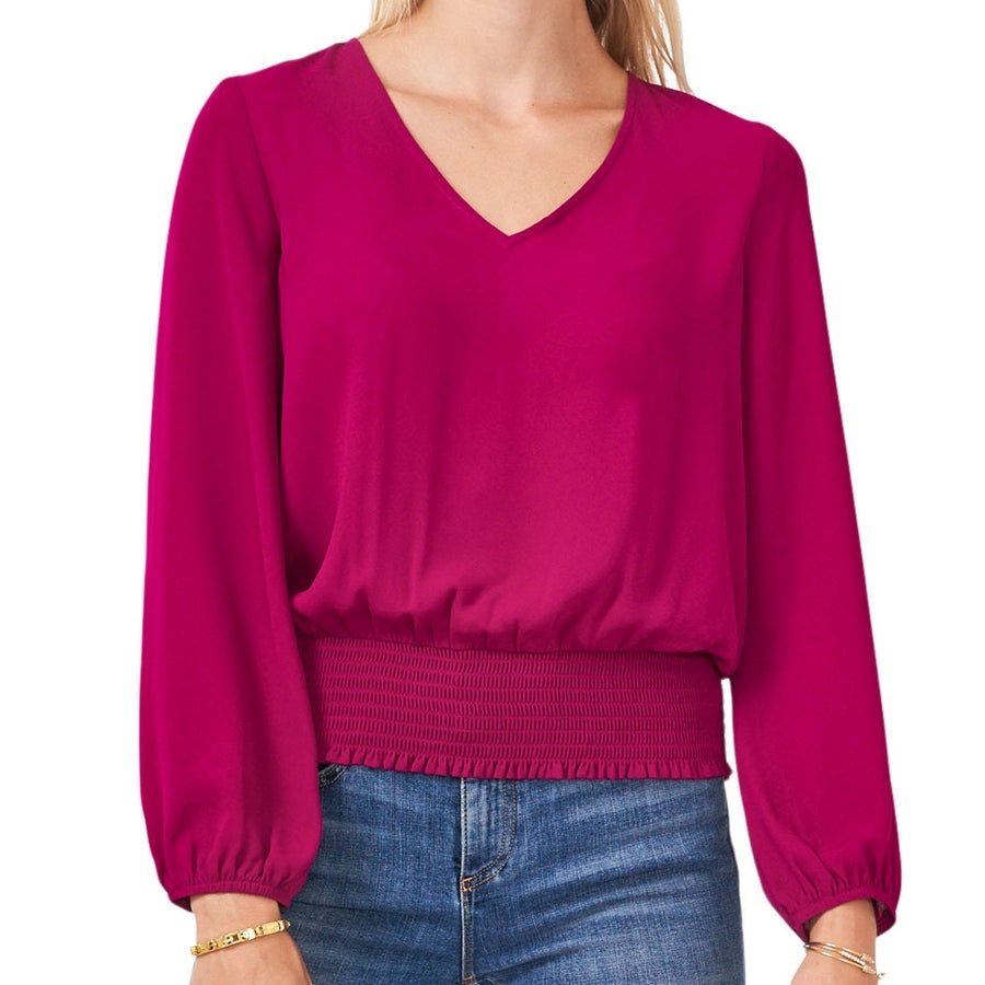 A V-neck blouse with a flattering smocked waist and balloon sleeve is a closet staple. Features elastic Cuff. Fabric is100% Polyester, Machine wash cold. Tumble dry if needed. Only available in size S. Colour - plum fairy