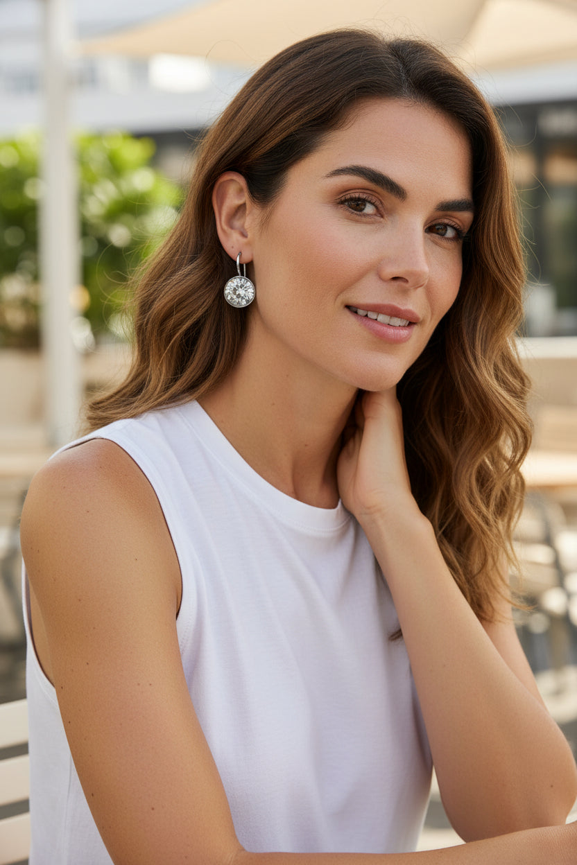 Round earrings featuring clear Swarovski® crystal elements (1.5cm diameter), finished with a secure leverback closure for comfortable, all-day wear. Designed to catch the light from every angle, the secure leverback closure offers comfortable, all-day wear with a polished finish. Perfect for everyday elegance or special occasions.