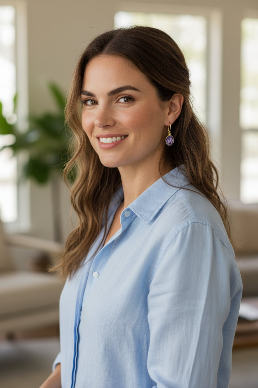 Round earrings featuring purple Swarovski® crystal elements (1cm diameter), finished with a secure gold coloured leverback closure for comfortable, all-day wear. Designed to catch the light from every angle, the secure leverback closure offers comfortable, all-day wear with a polished finish. Perfect for everyday elegance or special occasions.