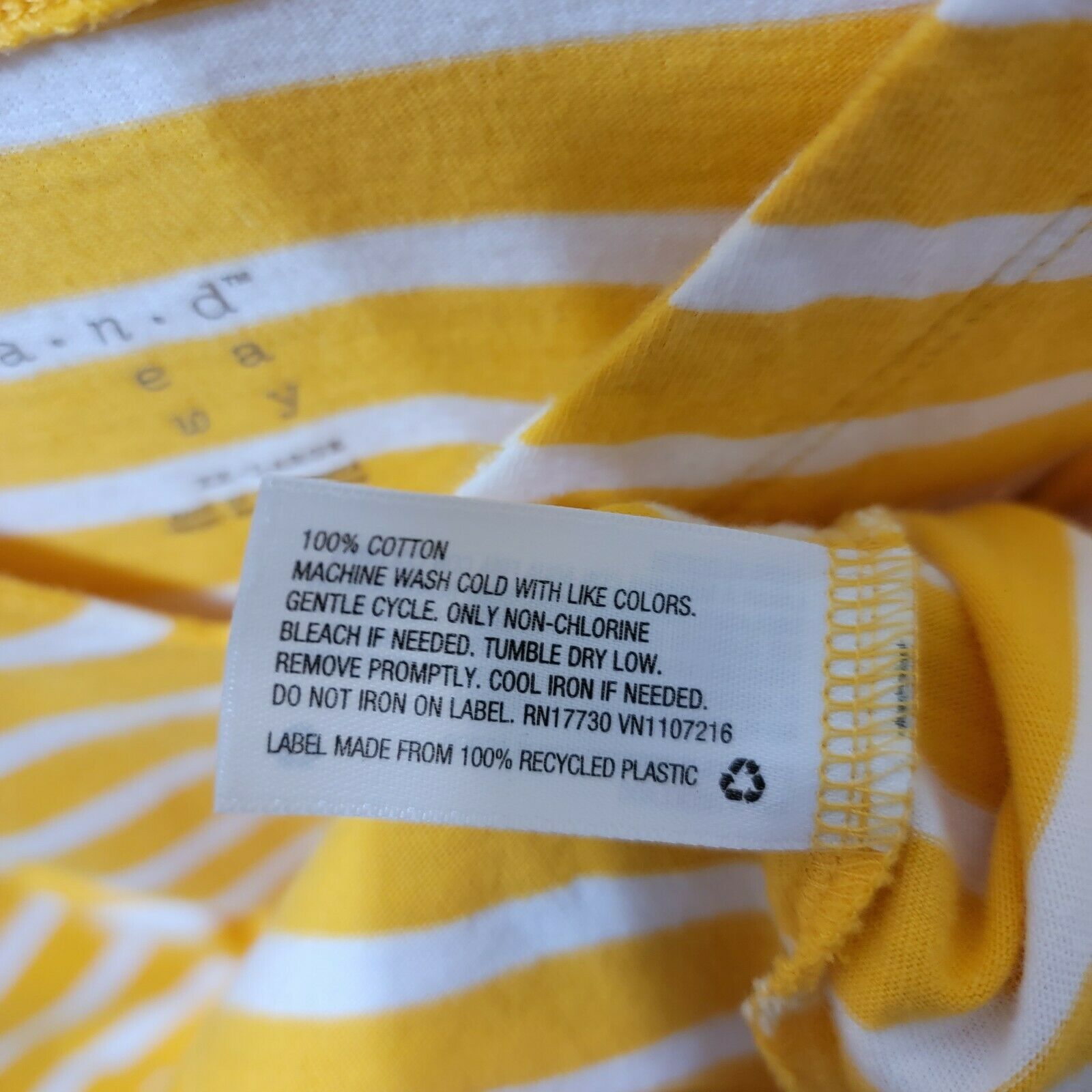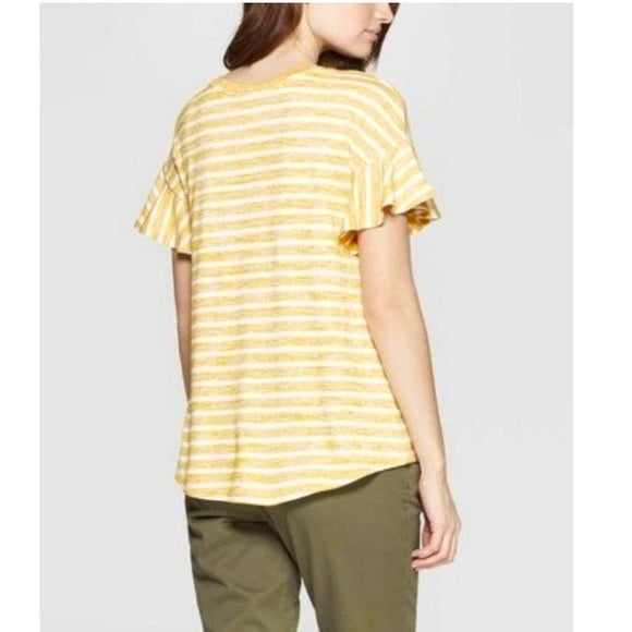 Women's Striped Ruffle / Flutter Sleeve T-Shirt from A New Day. Flutter short sleeves, and features a striped mustard yellow and white pattern and a V-neckline. Material: 48% Polyester, 48% Rayon, 4% Spandex